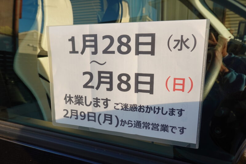 1月28日(水)~2月8日(日)までの12日間、車両の修理及びメンテナンスのため、お休みさせていただきます。ご利用の皆様にはご迷惑をおかけしてまことに申し訳ございません。